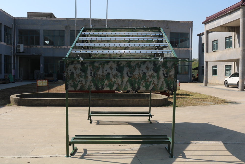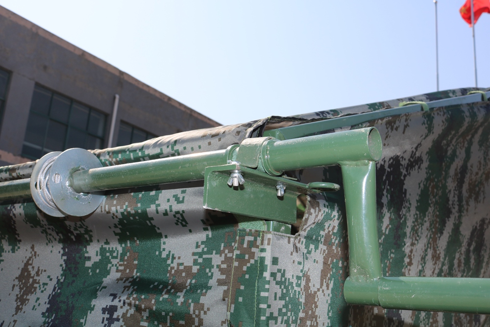 尺寸:4.*2*1.8*2.7m 布 料:07数码迷彩牛津布 结构:框架结构 杆 件:Φ38*38*1.5mm方管 重量:155kg 包装尺寸:2*0.75*0.4m 配件:铁锤、地钉 、鞋架*2个