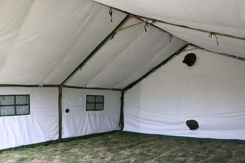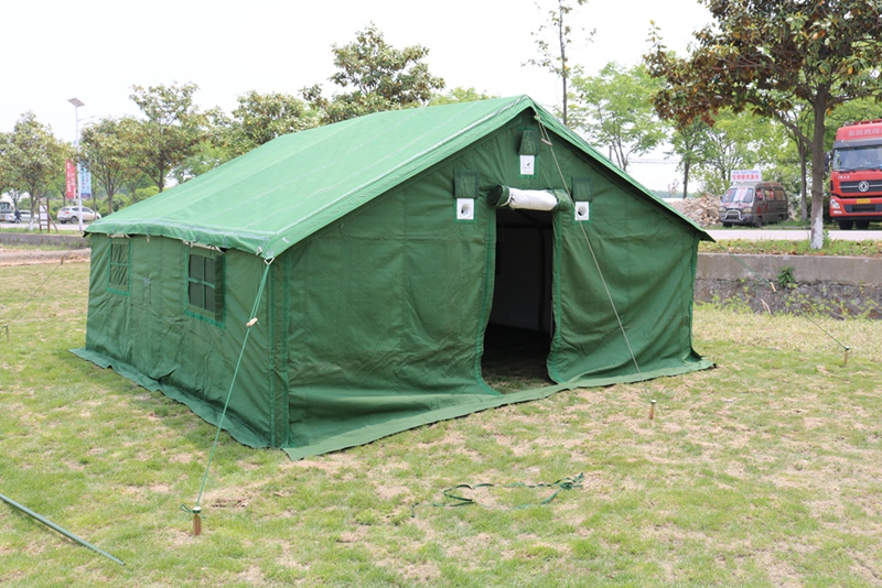 尺寸:4.4*4.6* 1.4*2.57m 外账 布料:28×2/28×2草绿或迷彩涤纶防水帆布 内账布料:13/1×13/1 白色阻燃涤纶平纹牛津布布 保温材料:300G合成针刺毡 结构:双坡面框架式结构 包装体积:0.42m3 重量:118kg 配件 :铁锤、风绳、地桩 容纳床数:4-6张双层军用床