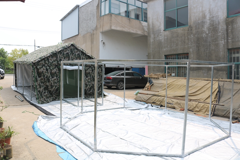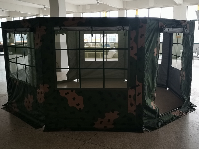 炊事帐篷:4*6m 八角围蓬:边长1.75 m高度1.95m 过道2*1.2m 外帐布料:07数码防水帆布 结构:框架结构38*38*1.2喷塑方管 保温材料:300g绗棉 配件:铁锤、地桩、风绳