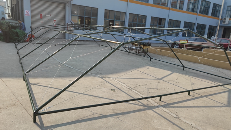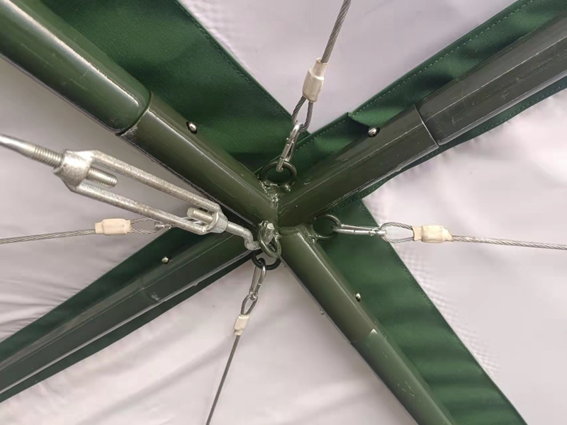 尺寸:10*6*1.9*3.1m 布料:28*2/2草绿防水帆布 结构:框架结构 保温材料:300g针刺毡 重量:600kg 包装体积:8个包装 配件:铁锤、风绳、地桩