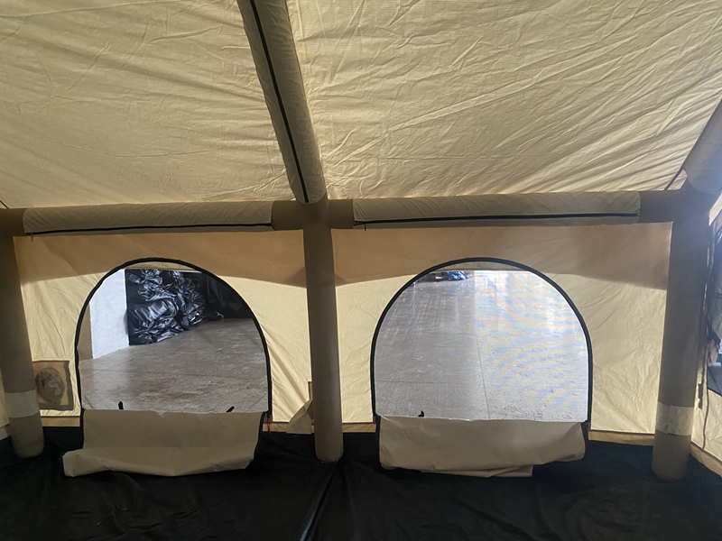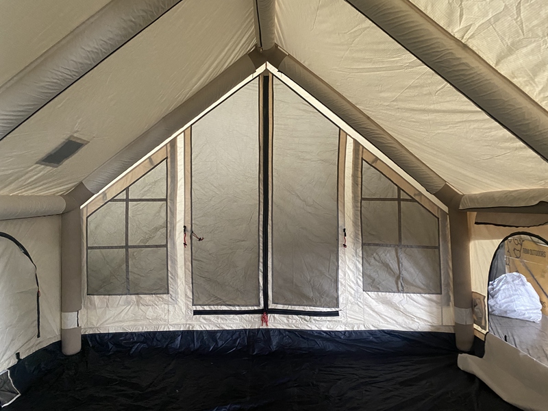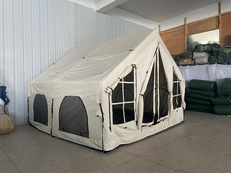 尺寸:3*3*1.1*2.3米 布料:300D卡其色方格牛津布 结构:pvc一体式气柱 地布:300D藏青色方格牛津布 重量:23.5kg 包装体积:74*43*47cm 配件:打气筒*1、风绳φ4mm*6根、地钉*18