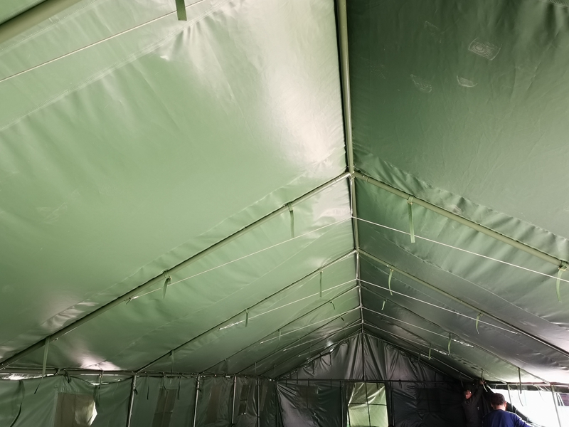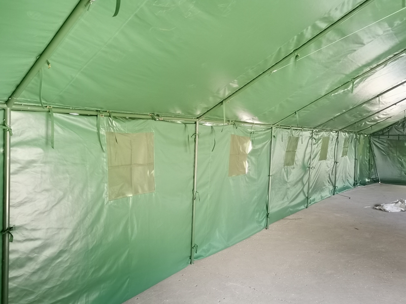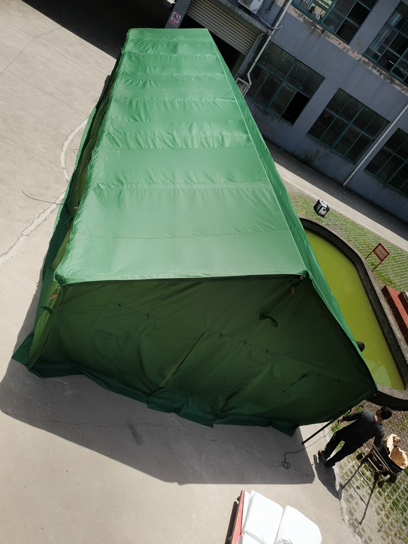 尺寸:5*15* 1.8*3.1m 布料:600D军绿色牛津布涂 PVC 结构:框架结构 杆 件:φ38*1.2mm焊接钢管 包装体积:0.9m³ 连 接 通:φ38*1.2mm焊接钢管 重 量:410.2kg 配 件:铁锤、地桩、风绳