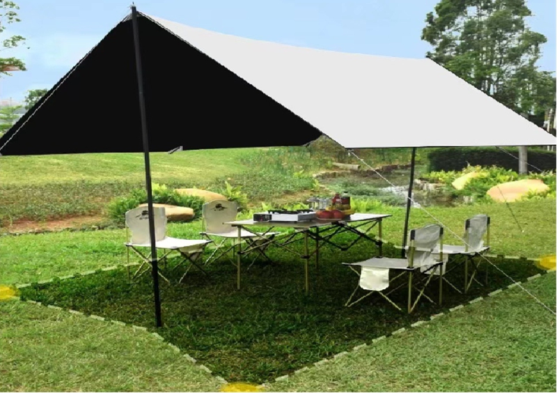 尺寸:3*4m 布料:210D米白色黑胶牛津布 结构:立杆支撑 杆件:分段式天幕杆 重量:3.5kg 配件:地钉、风绳