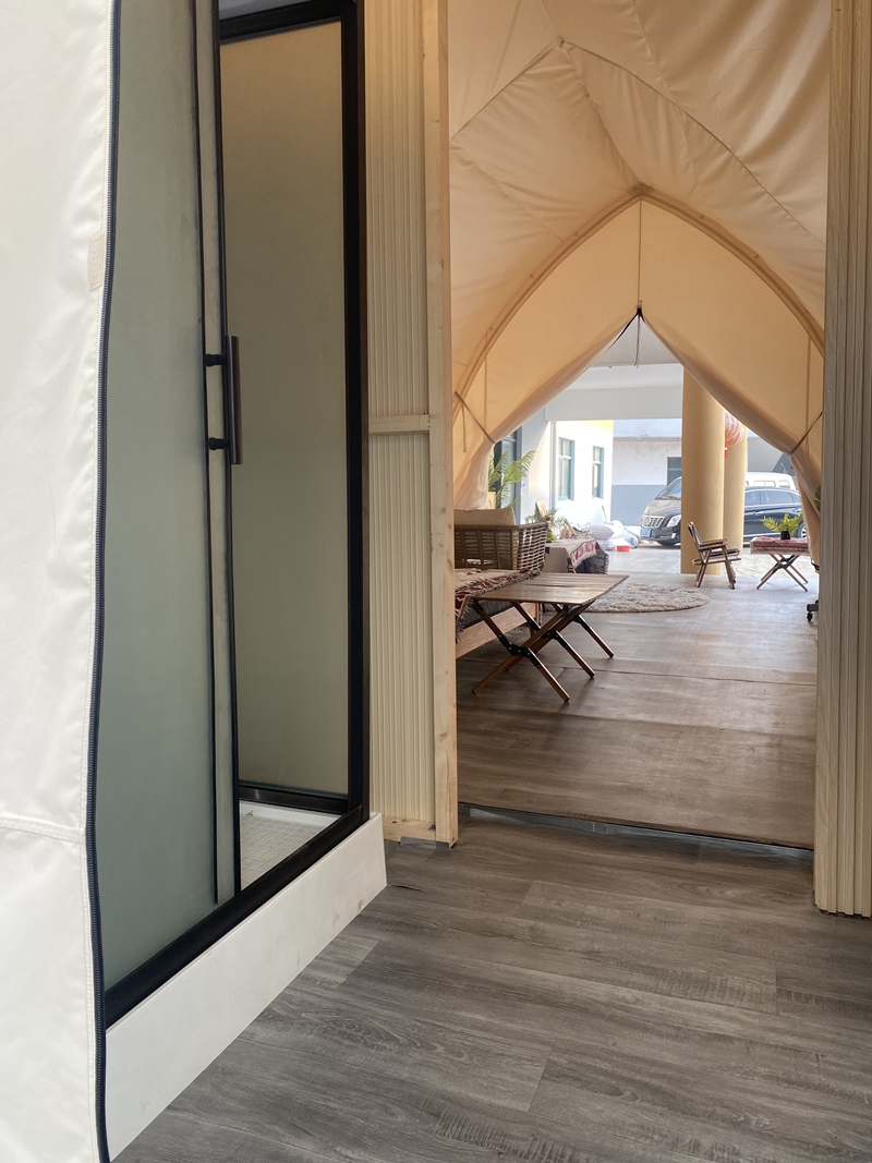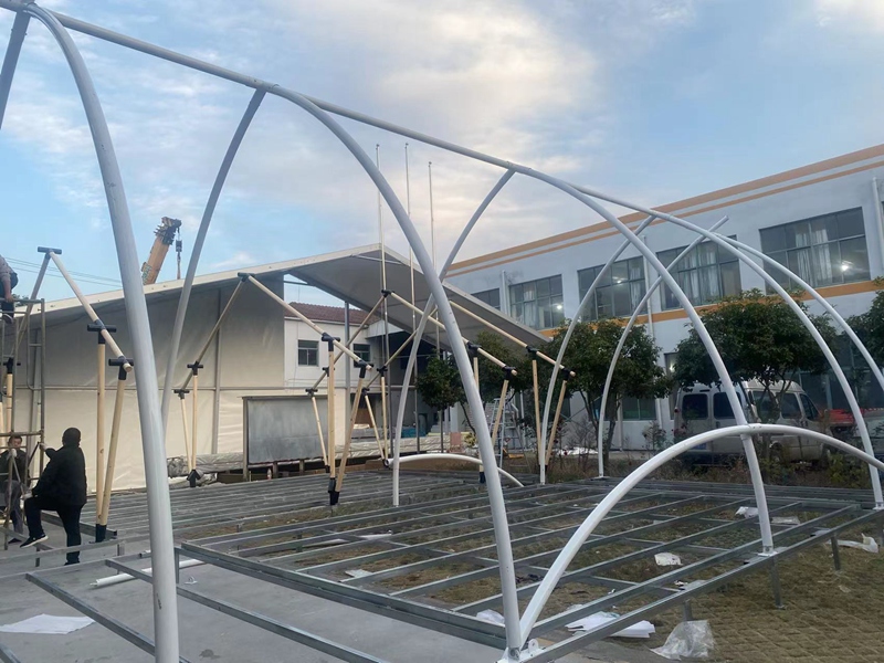 尺寸:10*5m 天幕布料:750gPVC张拉膜 内账布料:900D米卡其色牛津布 (防水压防紫外线阻燃防,防霉防蚊虫) 主杆:76mm镀锌钢管,壁厚1.5mm 连 接 杆:83mm钢管,壁厚2.0mm