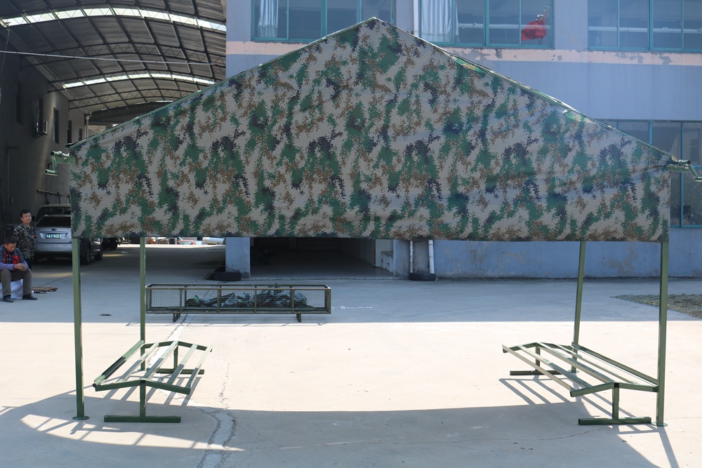 尺寸:4.*2*1.8*2.7m 布 料:07数码迷彩牛津布 结构:框架结构 杆 件:Φ38*38*1.5mm方管 重量:155kg 包装尺寸:2*0.75*0.4m 配件:铁锤、地钉 、鞋架*2个