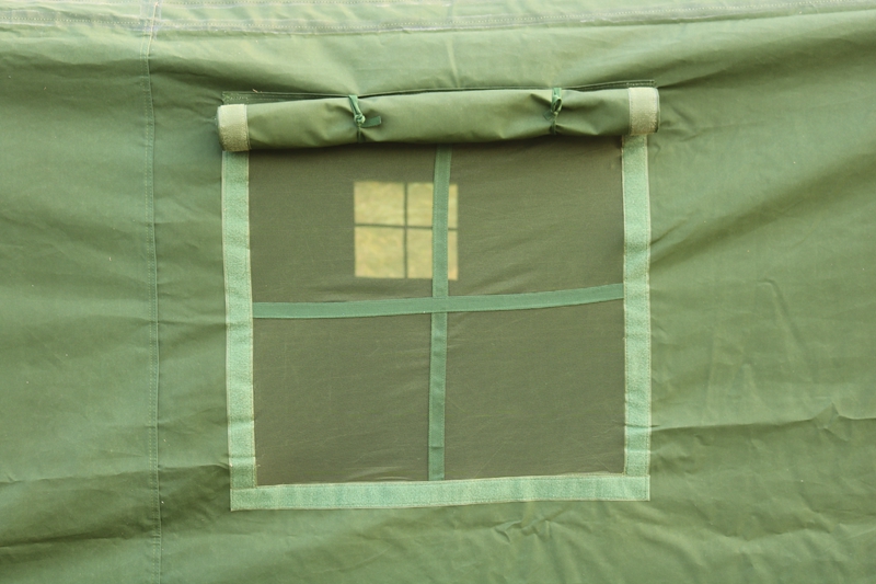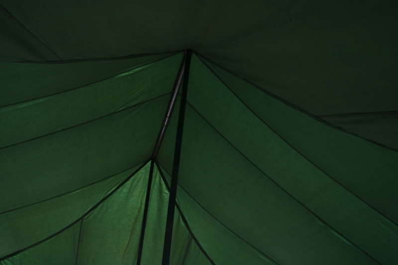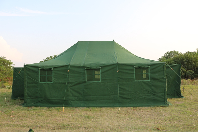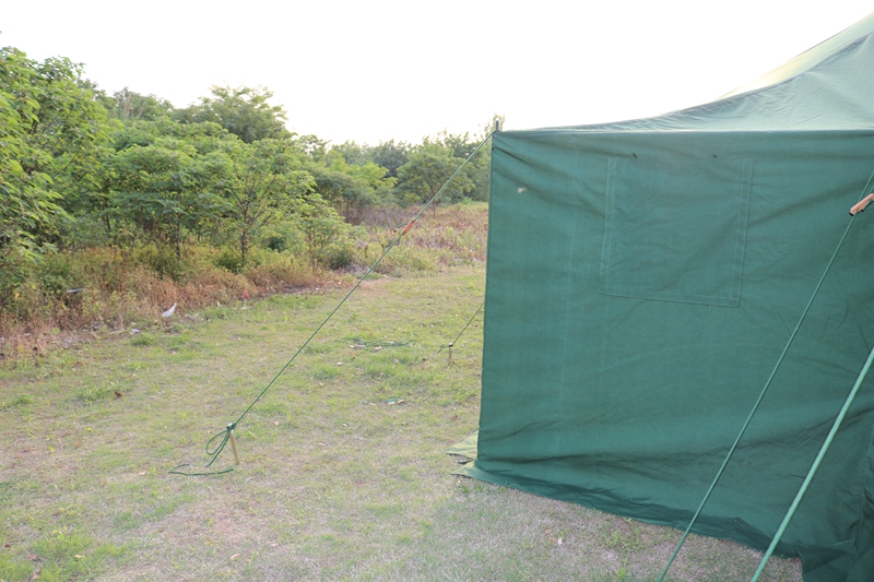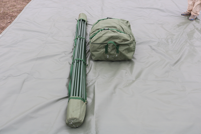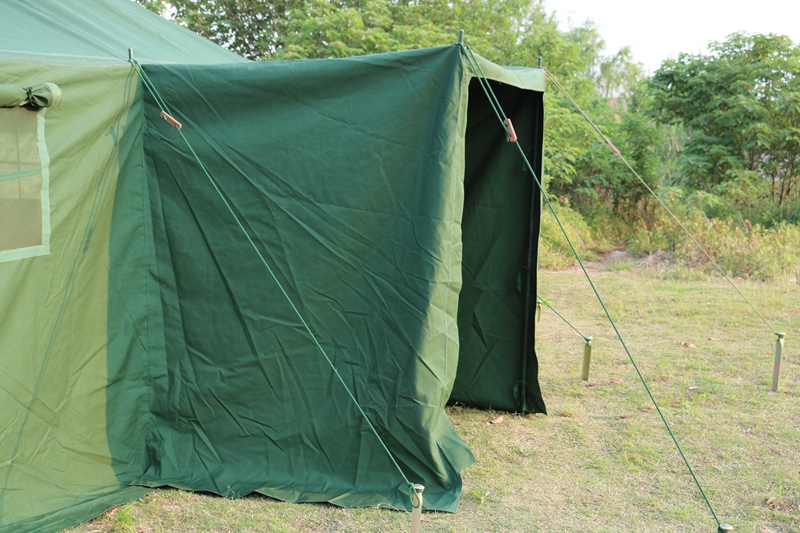 尺寸:6*5*1.8*3.2m 外帐布料:28*2/2涤纶草绿色防水帆布 结构:立杆结构 中 立 柱:φ38*1.2mm 边 围 柱:φ25*1.2mm 重 量:80kg 包装体积:0.3m³ 配 件:铁锤、地桩、风绳
