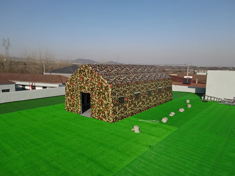 尺寸:5.5*10.5*2.1m 布料:1000D750g迷彩PVC刀刮布 结构:pvc一体式气柱 地布:650g灰色PVC 配件:打气筒、风绳、地钉