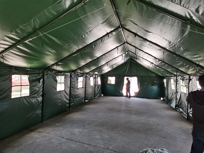 尺寸:5*15* 1.8*3.1m 布料:600D军绿色牛津布涂 PVC 结构:框架结构 杆 件:φ38*1.2mm焊接钢管 包装体积:0.9m³ 连 接 通:φ38*1.2mm焊接钢管 重 量:410.2kg 配 件:铁锤、地桩、风绳