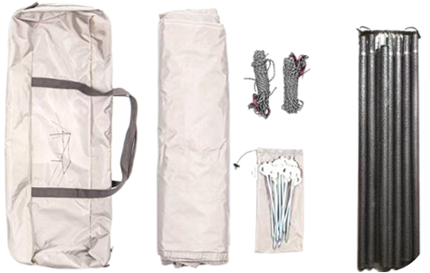 尺寸:3*4m 布料:210D米白色黑胶牛津布 结构:立杆支撑 杆件:分段式天幕杆 重量:3.5kg 配件:地钉、风绳